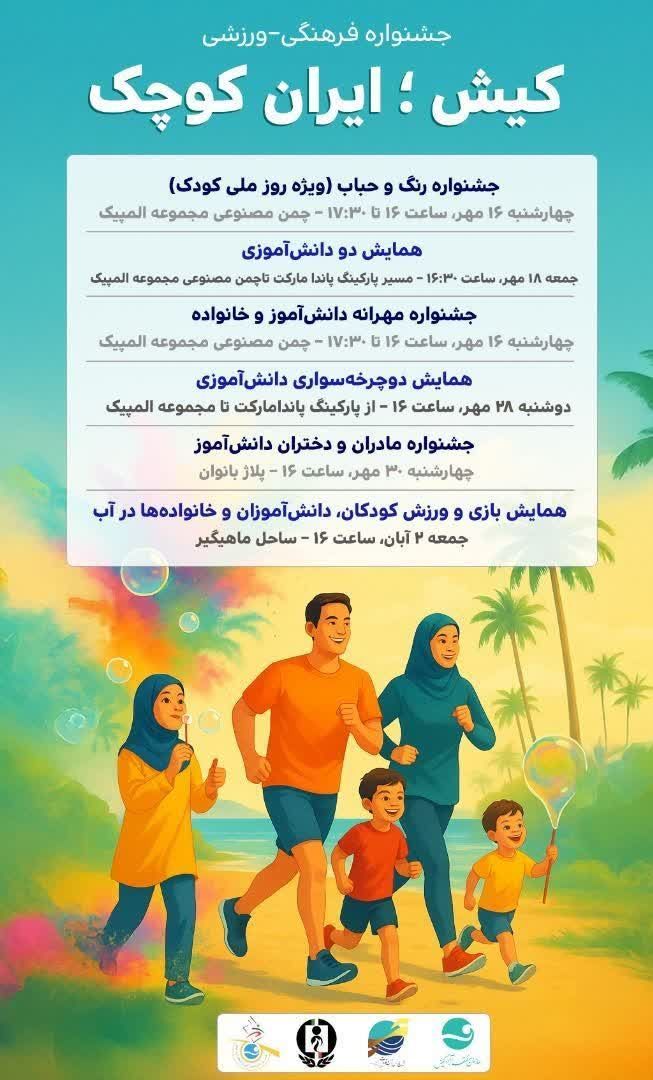 کیش- جشنواره بزرگ فرهنگی ورزشی «کیش؛ ایران کوچک» با همکاری و مشارکت معاونت ورزش و تفریحات سالم کیش، شورای هماهنگی مبارزه با موادمخدر، هیئتهای ورزشی و اداره امور زنان و خانواده با محوریت نشاط اجتماعی و پیشگیری از آسیب های اجتماعی از ۱۶ مهر تا ۲ آبان در نقاط مختلف جزیره کیش برگزار میشود.